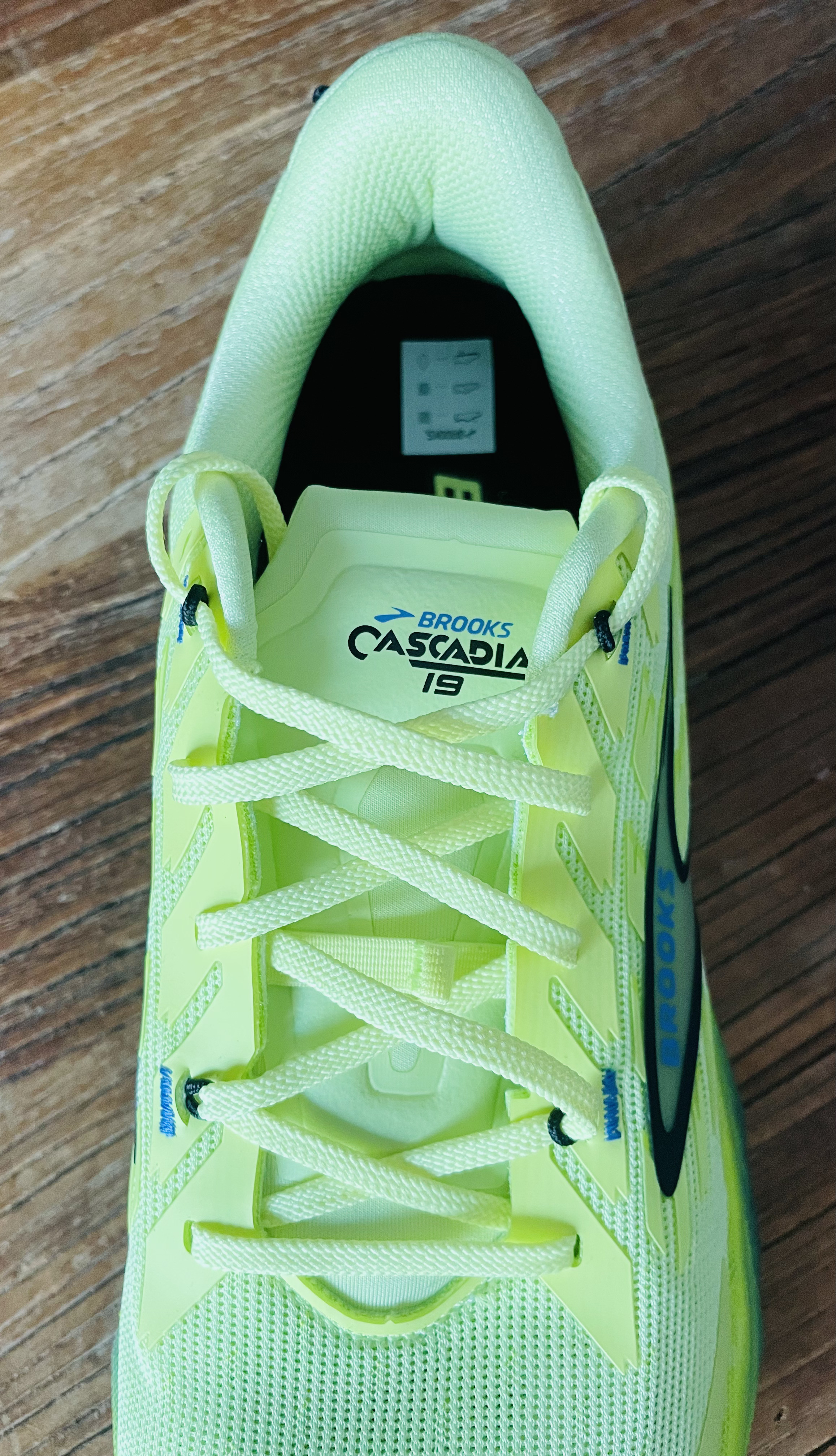 Le pied est parfaitement lové dans un chaussant très agréable. L’ arrière du pied se place dans la coque talonnière rigide et pourvue d’ une belle épaisseur de mousse. Le médio pied est très bien soutenu par une languette attenante épaisse (aucune chance d’avoir des douleurs causées par les lacets) et un laçage très précis obtenu par 6 œillets. D’ailleurs ce système de laçage est un des changements sur la Cascadia 19. A l’avant du pied, la toebox n’est pas vraiment large. Les orteils sont bien maintenus. L’avant pied est légèrement plus large que sur l’ancienne Cascadia.
