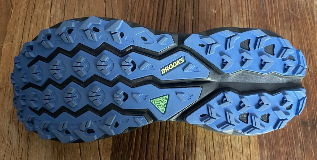 Depuis la Cascadia 17, Brooks propose une semelle composée de 6 parties distinctes. Ce qui permet d’ obtenir encore plus d’ adhérence et d’ accroche. En effet, la semelle épouse au maximum le sol avec ces 6 zones dissociées les unes des autres.