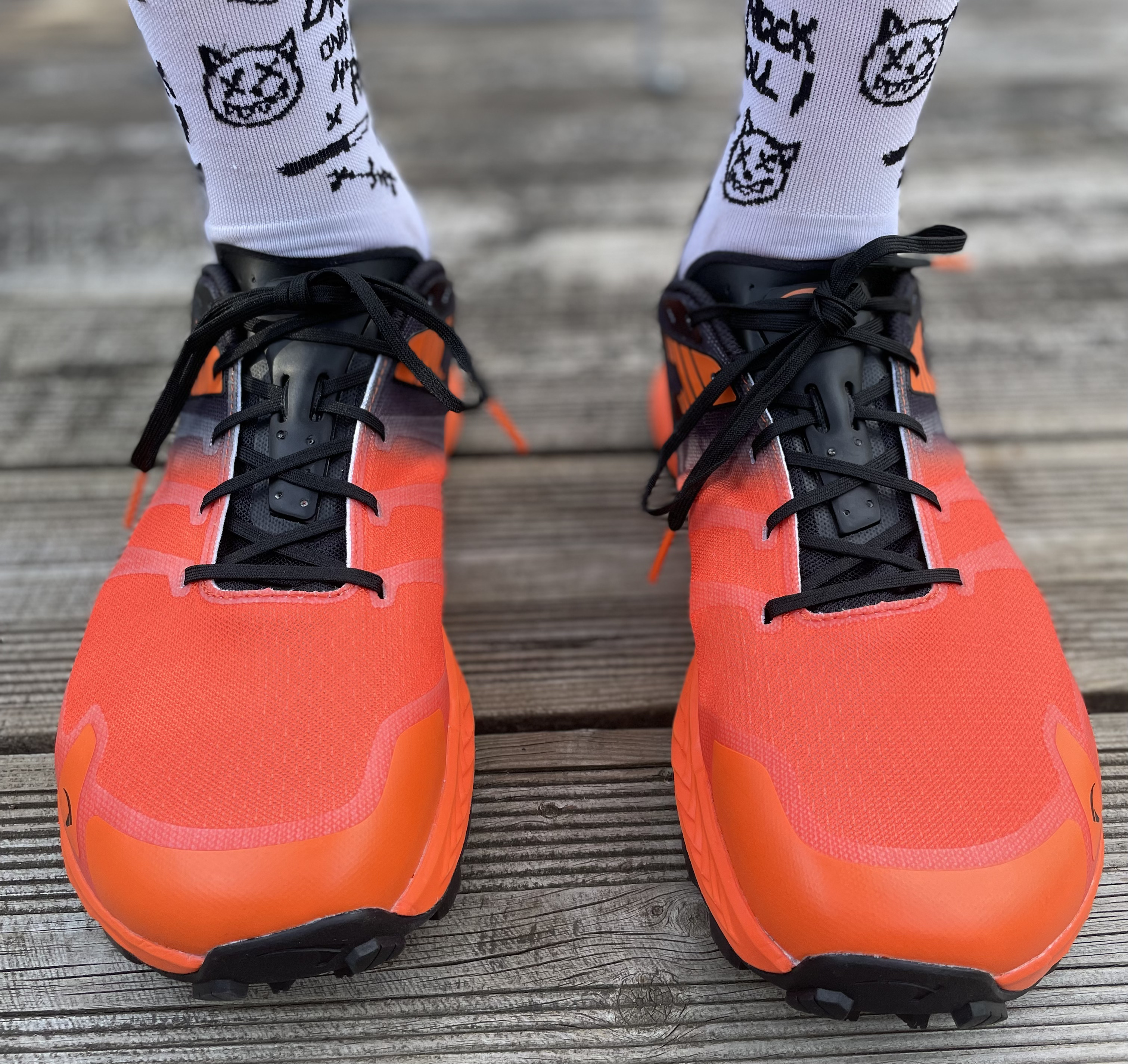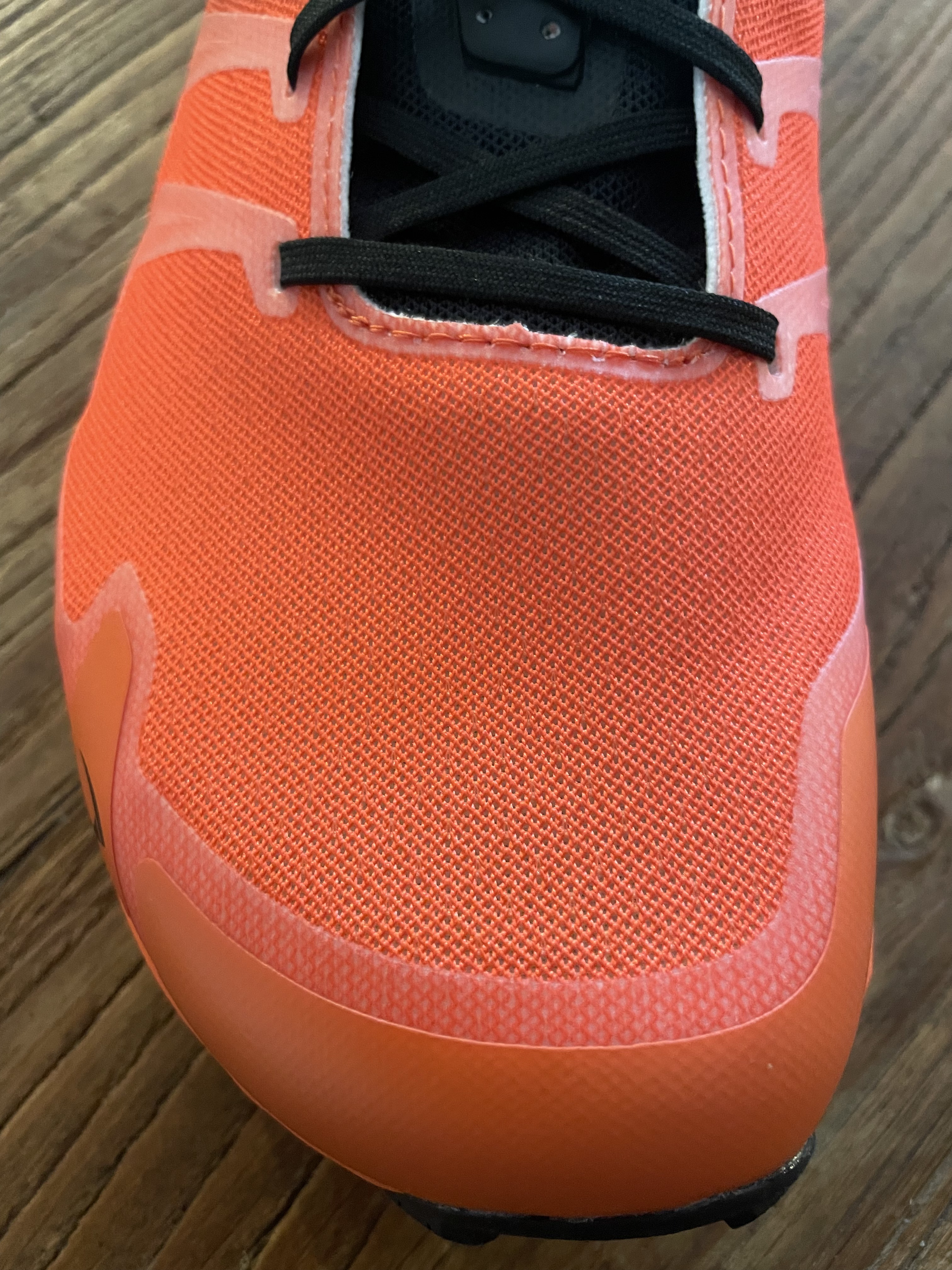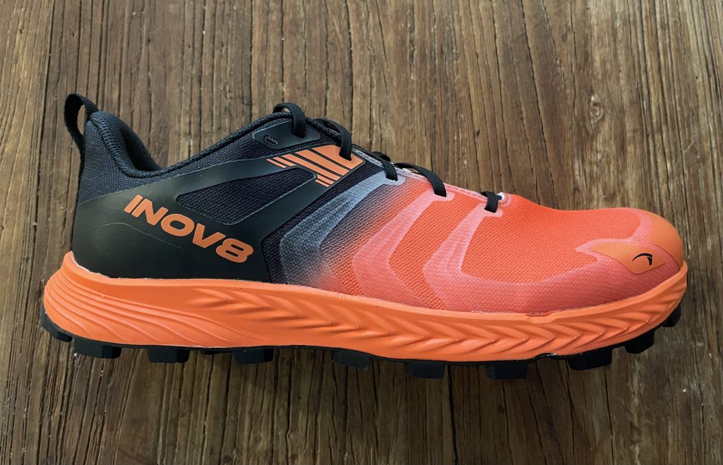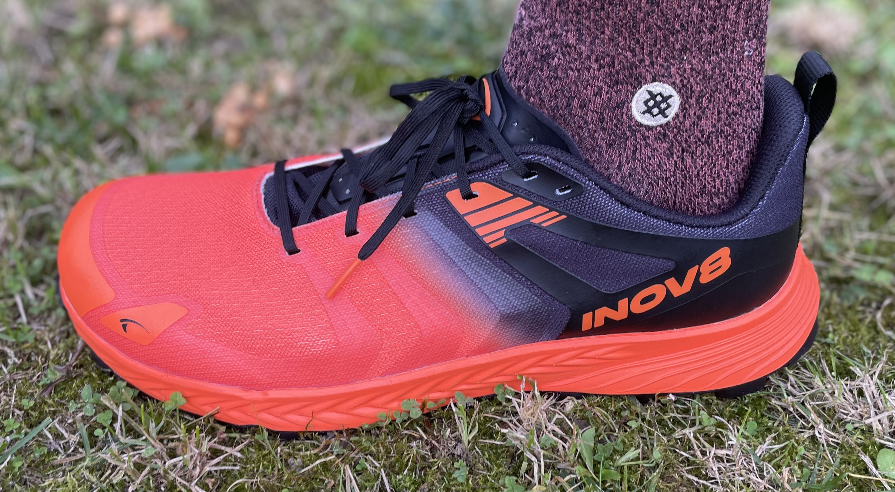 La première chose que je remarque lorsque je découvre la Inov8 est la semelle extérieure très agressive. Des beaux crampons en forme de sabots de chèvre qui me laisse à penser qu’elle va bien accrocher.