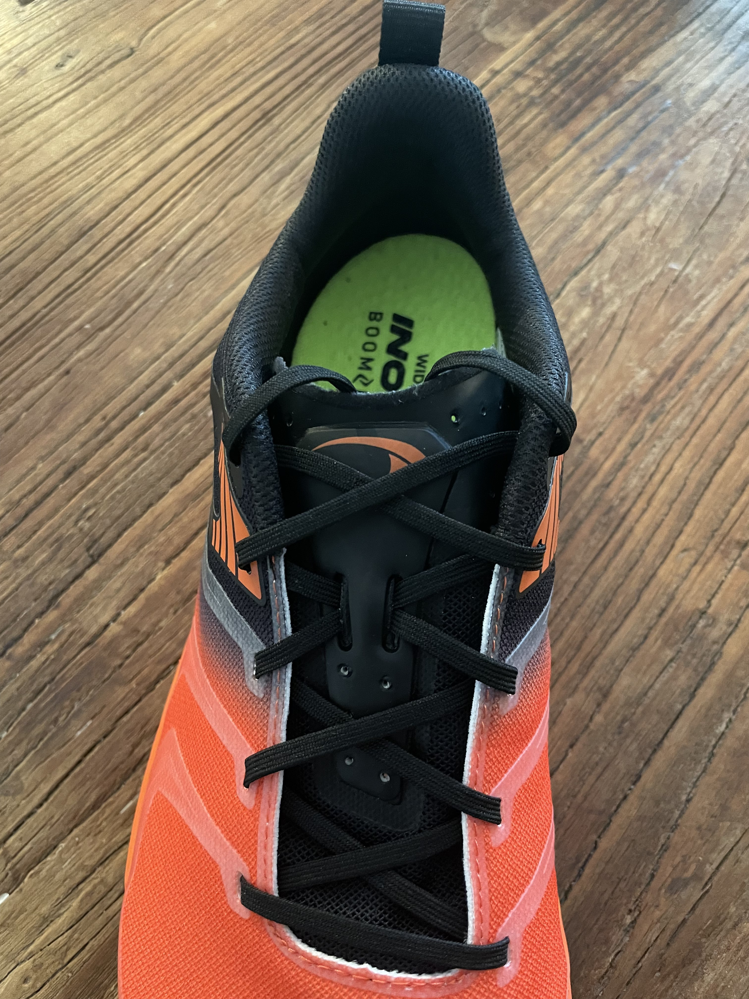 Le mesh mono couche et les renforts TPU permettent d’avoir une tige robuste. De plus, la tige est vraiment respirante. Même sous plus de 30 degrés, je n’ai jamais ressenti de surchauffe aux pieds. La languette épouse très agréablement le cou de pied. Attention aux lacets un peu longs et qui se dénouent facilement.
